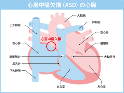 心房中隔欠損とは、心臓の中の右心房と左心房の間にある心房中隔という仕切りに「穴」(欠損孔)がある先天性の心臓病です。欠損孔を通じて左心房から右心房へ血液が流れ込みます。幼少期には症状がないことが多く、学校検診の際に心雑音や心電図異常で発見されることも多い病気です。治療せずに放置すると、労作時息切れ、呼吸困難、むくみといった心不全症状が現れ、日常生活の質が著しく低下するだけでなく、生命の危険に至ることが知られています。