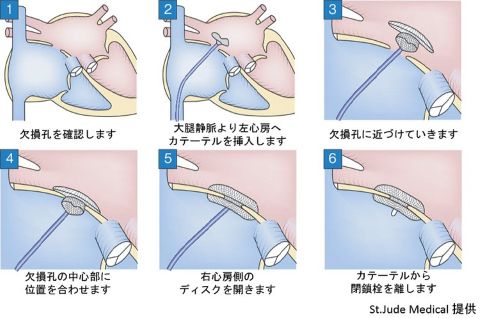 方法ですが、1cm弱の太さのカテーテルを、足の付け根の太い静脈(大腿静脈)から挿入します。卵円孔を通して右心房から左心房へガイドワイヤーを進めます。閉鎖栓のディスクを開き、欠損孔が閉鎖していることを確認後、カテーテルから閉鎖栓を切り離し留置します。