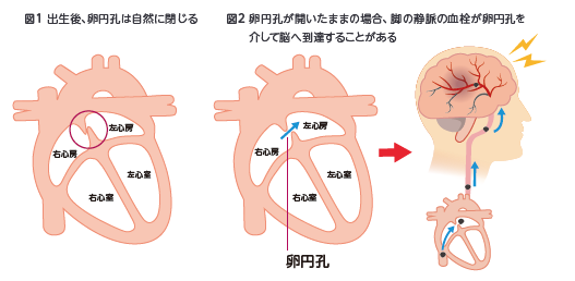 これがあっても、通常は症状がなく問題となることはありませんが、ある特定の状況(お腹に圧力のかかる状況,咳や排便など)では、卵円孔が開いて血液の漏れが起きます。この時に、足などの静脈にできた血液の塊(血栓)が卵円孔を通って右心房から左心房に流れ、脳の血管に詰まれば、脳梗塞を起こします。重症の場合には手足の麻痺や言語障害などの後遺症を残します。このような脳梗塞は、比較的若い人に多いことが特徴です。